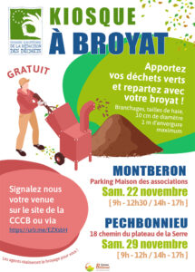 À l’occasion de la Semaine Européenne de la Réduction des Déchets, la Communauté de Communes des Coteaux Bellevue organise un « Kiosque à Broyat » le vendredi 22 novembre à Montberon et vendredi 29 novembre à Pechbonnieu.