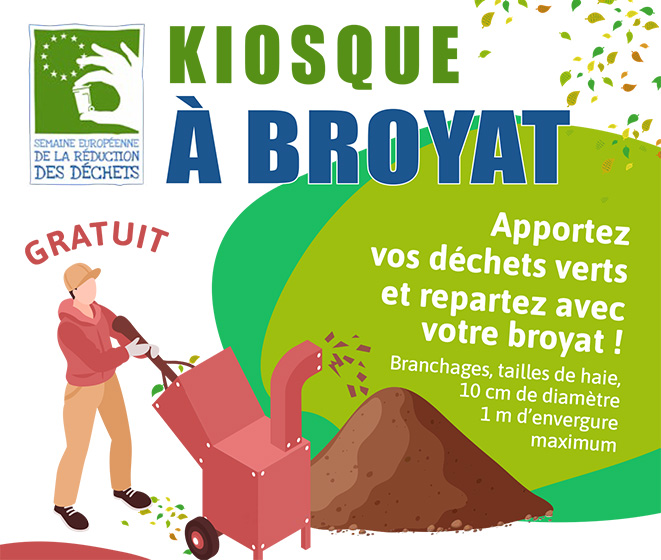 À l’occasion de la Semaine Européenne de la Réduction des Déchets, la Communauté de Communes des Coteaux Bellevue organise un « Kiosque à Broyat » le vendredi 22 novembre à Montberon et vendredi 29 novembre à Pechbonnieu.