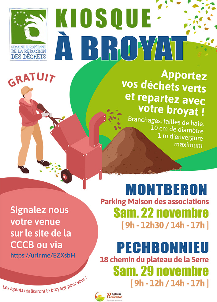 À l’occasion de la Semaine Européenne de la Réduction des Déchets, la Communauté de Communes des Coteaux Bellevue organise un « Kiosque à Broyat » le samedi 22 novembre à Montberon et samedi 29 novembre à Pechbonnieu.