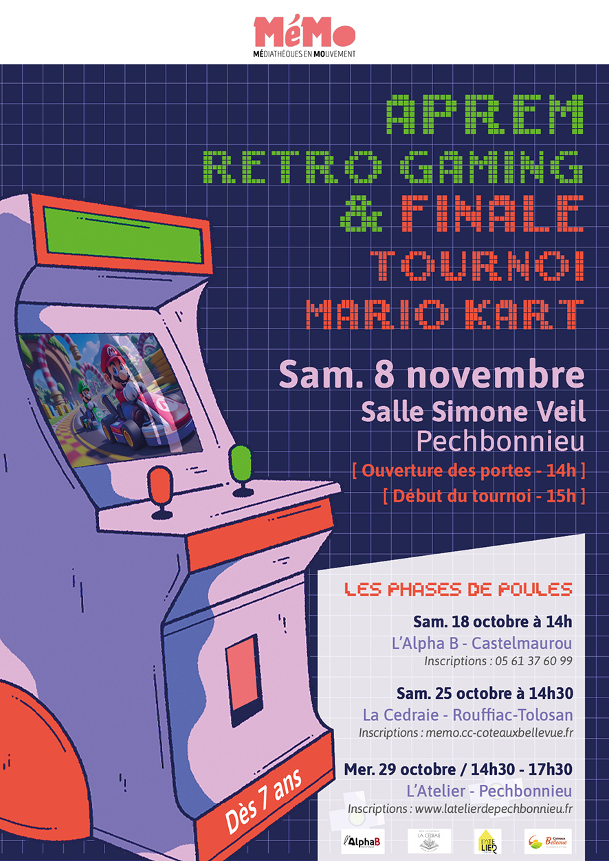 Les médiathèques de Pechbonnieu, Castelmaurou et Rouffiac-Tolosan organisent un tournoi de Mario Kart dont la finale aura lieu à Pechbonnieu dans la salle Simone Veil le Samedi 8 novembre 2025.